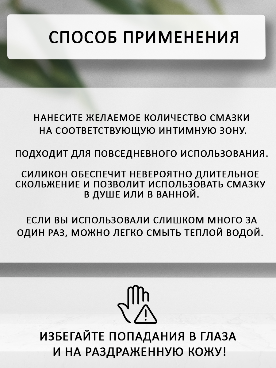 Средство остается на поверхности кожи, не впитывается и легко смывается водой при необходимости. Не рекомендуется использовать с силиконовыми игрушками.