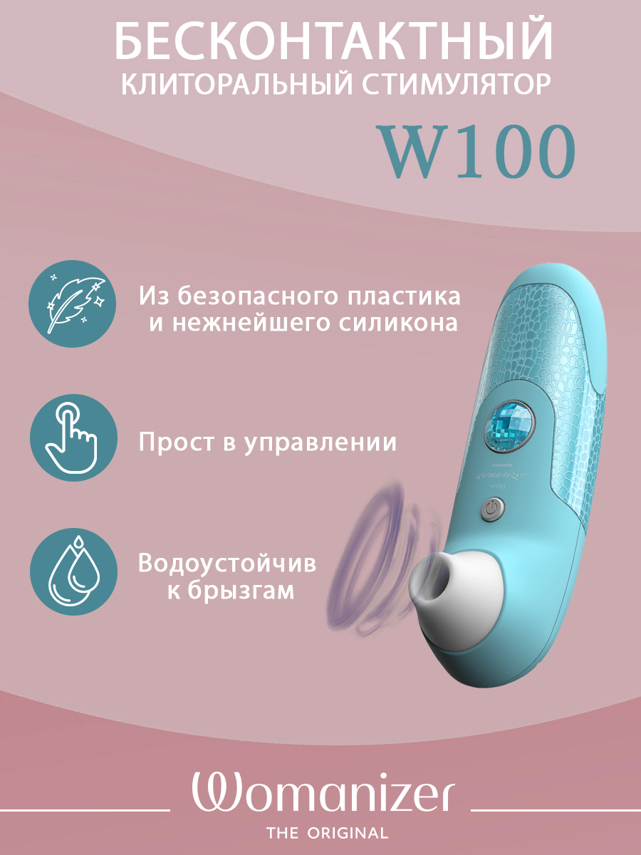 Womanizer W100 выполнен из безопасного для тела пластика и гипоаллергенного нежнейшего силикона. Он порадует своих хозяек 6 режимами стимуляции и элементарным управлением. Также девайс обладает стильным дизайном и небольшим размером: длина 16 см, ширина 5 см. Водоустойчив к брызгам.
