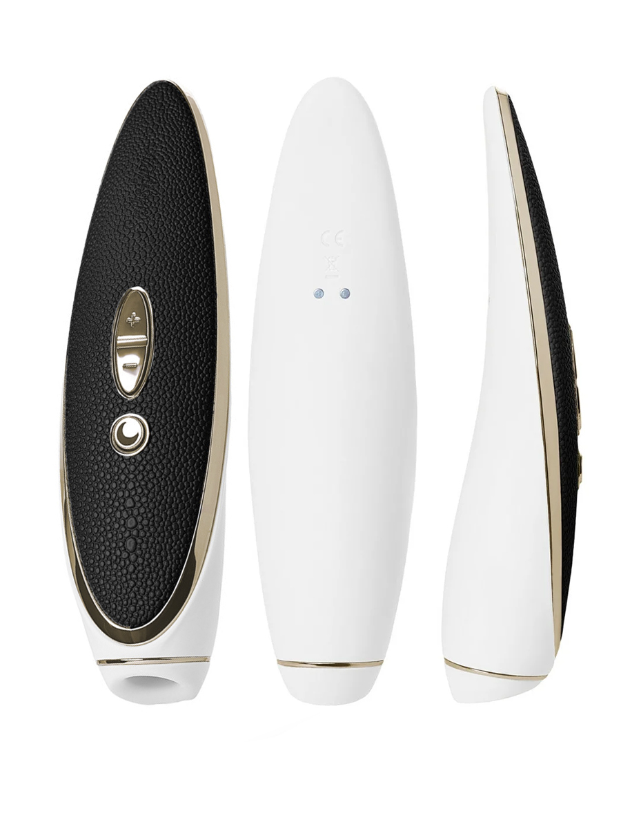 Бесконтактный женский стимулятор попал в коллекцию Luxury неспроста. Около 75% игрушки – ручная работа. Ее верхняя часть выполнена из натуральной темной кожи и алюминия, а нижняя белая часть – нежнейшего силикона. Она абсолютно водоустойчива, что делает ее очень удобной в плане ухода, но на долгое время помещать девайс под воду не рекомендуется.
