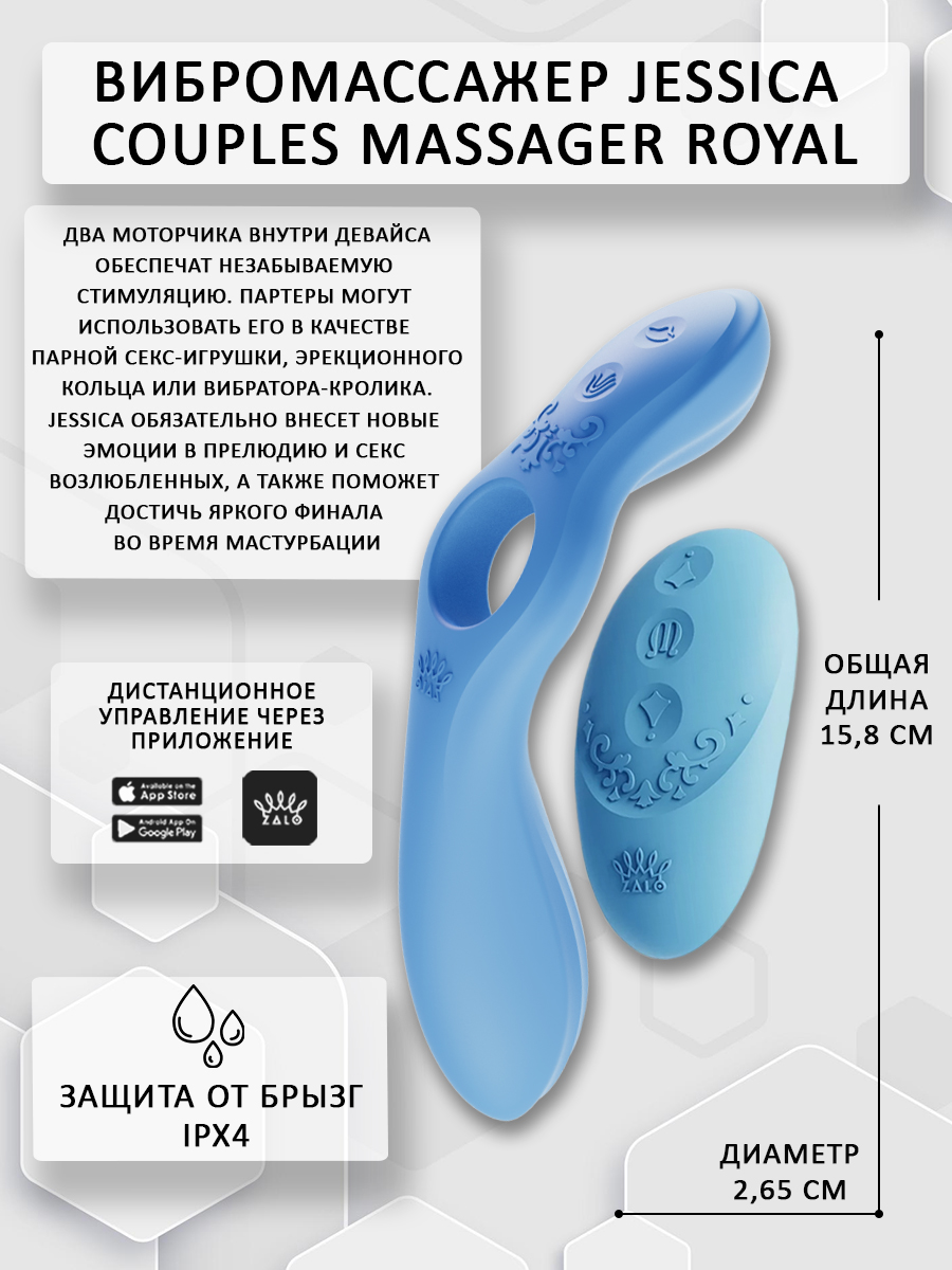 Также изделие порадует своих обладателей тихими, но мощными 8 режимами вибрации и возможностью дистанционного управления с помощью приложения ZALO REMOTE или пульта дистанционного управления (до 8 м). Водоустойчиво к брызгам (IPX4). Общая длина – 15,8 см, диаметр – 2,65 см. Ширина отростков – 3,4 см. Время до полной зарядки – 120 минут. Время работы – до 3 часов.