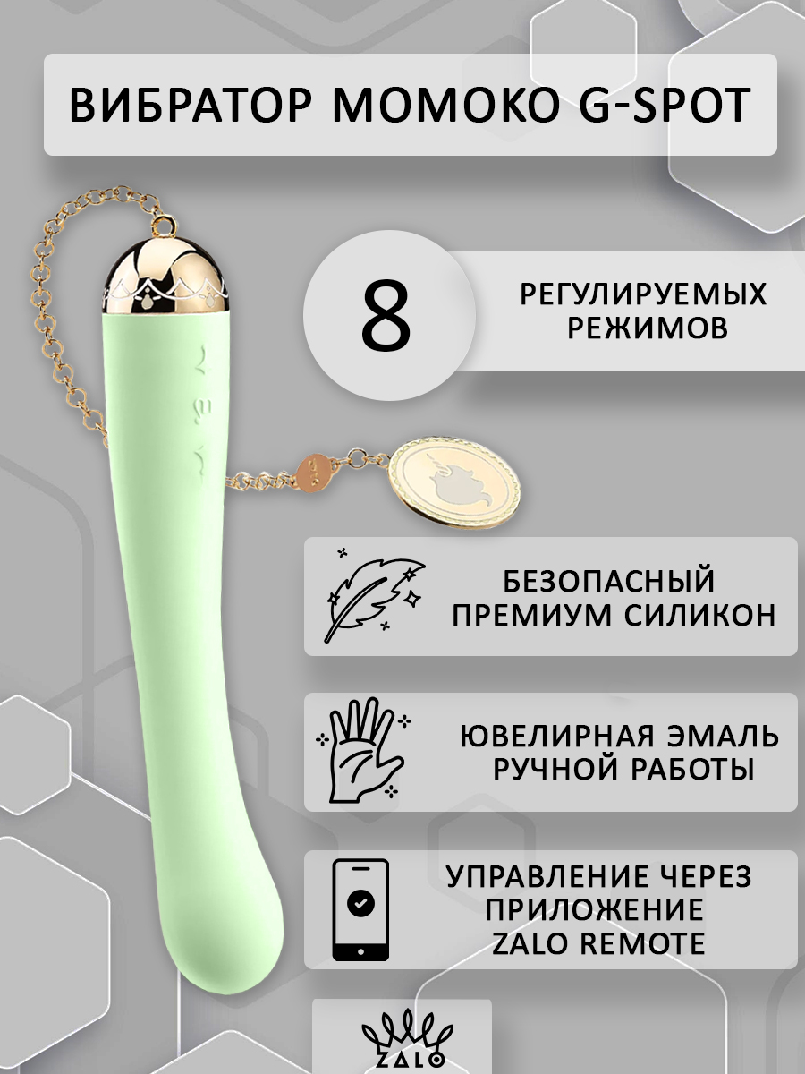 Утонченный и изысканный вибратор от компании Zalo способен покорить сердце каждой девушки. Он выполнен из премиум-силикона, а сверху имеет шелковистое покрытие Softek. Девайс завершает притягательная съемная цепочка с золотым покрытием (18К) на поверхности металла. Momoko обладает эргономичной формой и немного утолщенной головкой для наилучшей стимуляции зоны точки G, чтобы каждая женщина могла получить свой незабываемый оргазм!