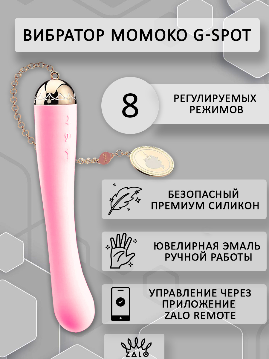 Утонченный и изысканный вибратор от компании Zalo способен покорить сердце каждой девушки. Он выполнен из премиум-силикона, а сверху имеет шелковистое покрытие Softek. Девайс завершает притягательная съемная цепочка с золотым покрытием (18К) на поверхности металла. Momoko обладает эргономичной формой и немного утолщенной головкой для наилучшей стимуляции зоны точки G, чтобы каждая женщина могла получить свой незабываемый оргазм!