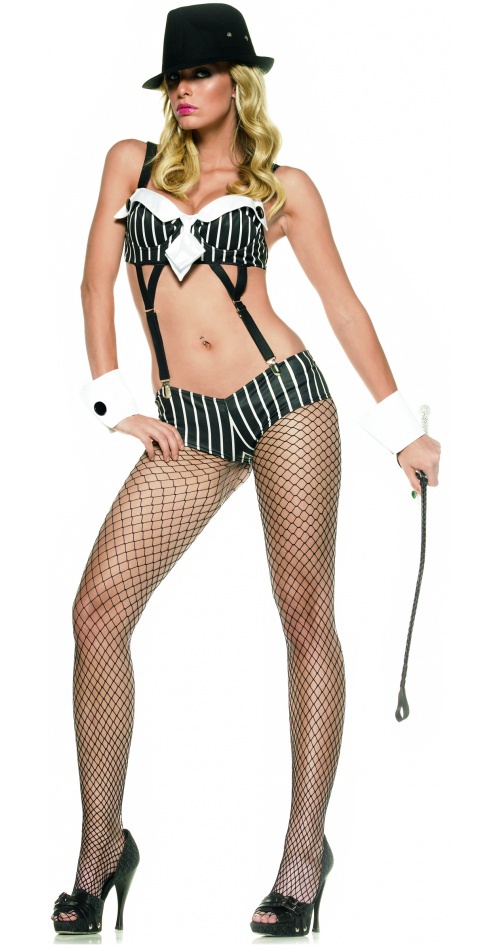 Комплект: оригинальная шляпка, бюстгальтер и шорты на подтяжках. Материал: 100% искусственный шелк. Цвет: черно-белый.