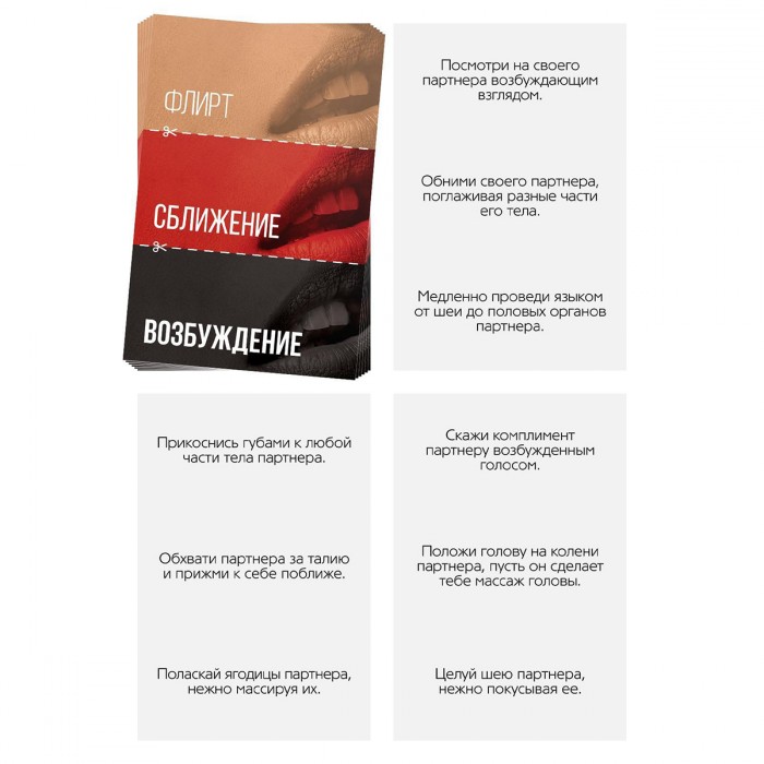 Игра для пар подарит партнерам отличную возможность опробовать новое. В нее входят 10 карт, которые будет необходимо разрезать по пунктирным линиям и разложить на 3 колоды: флирт, сближение, возбуждение. Необходимо начать с первой, вытягивать карточки по очереди, выполнять задания и по окончанию – перейти к следующей. Воплотите в жизнь свои самые смелые фантазии!