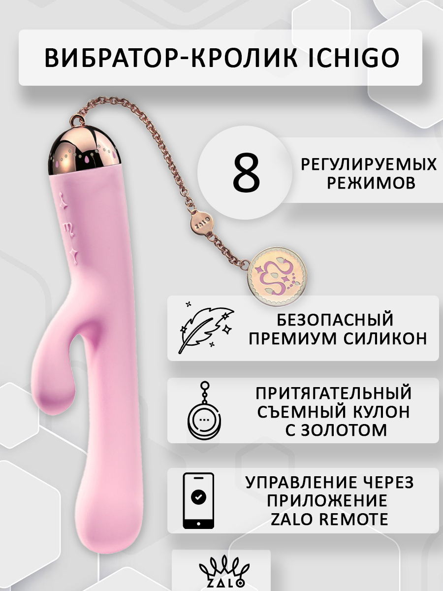 Утонченный и изысканный вибратор-кролик от компании Zalo способен покорить сердце каждой девушки. Он выполнен из премиум-силикона, а сверху имеет шелковистое покрытие Softek. Девайс завершает притягательная съемная цепочка с золотом на поверхности металла. Ichigo обладает эргономичной формой и немного утолщенной головкой для наилучшей стимуляции зоны точки G, а вибрирующий клиторальный отросток не оставит ни одну представительницу прекрасного пола без оргазма!