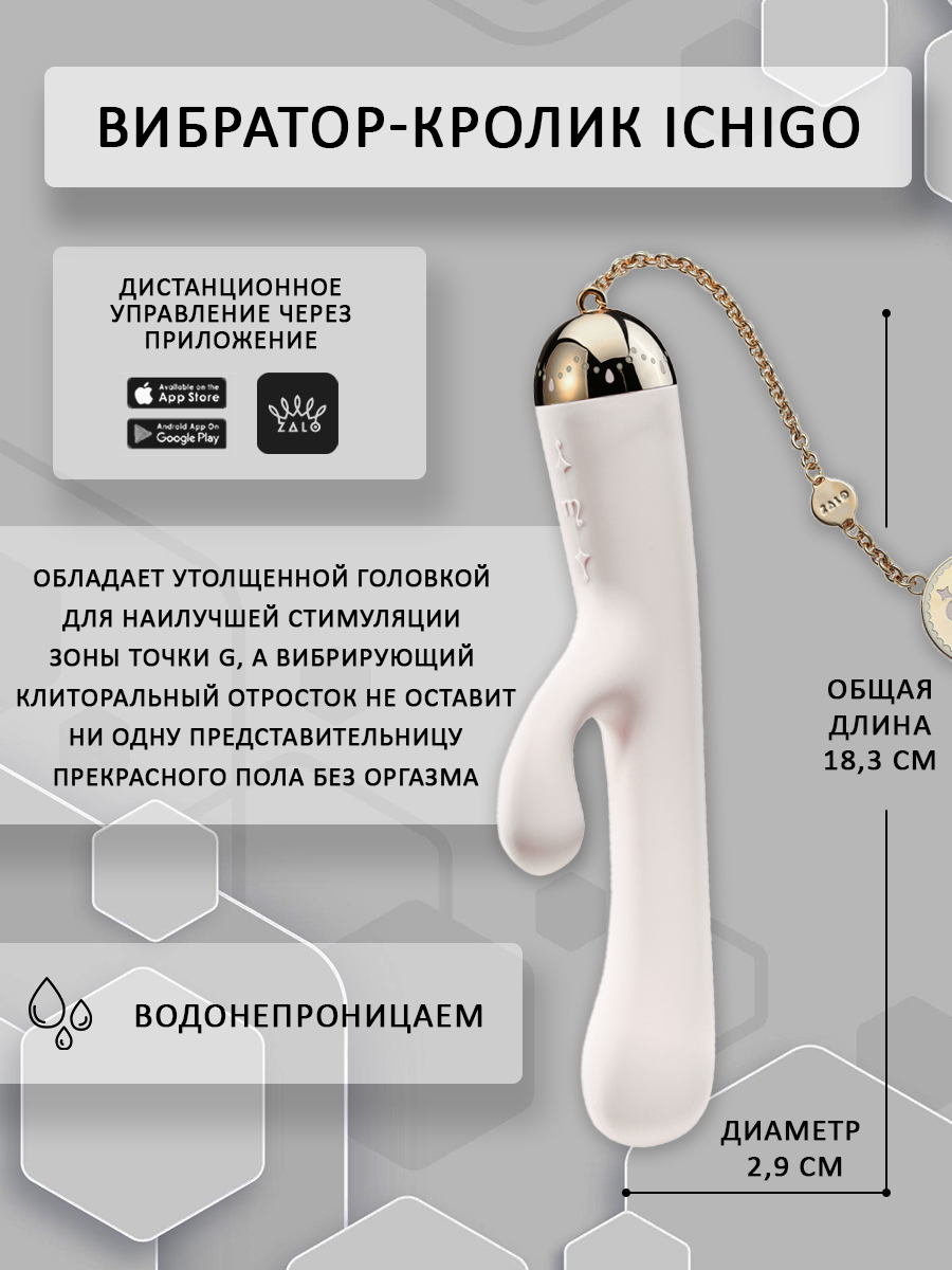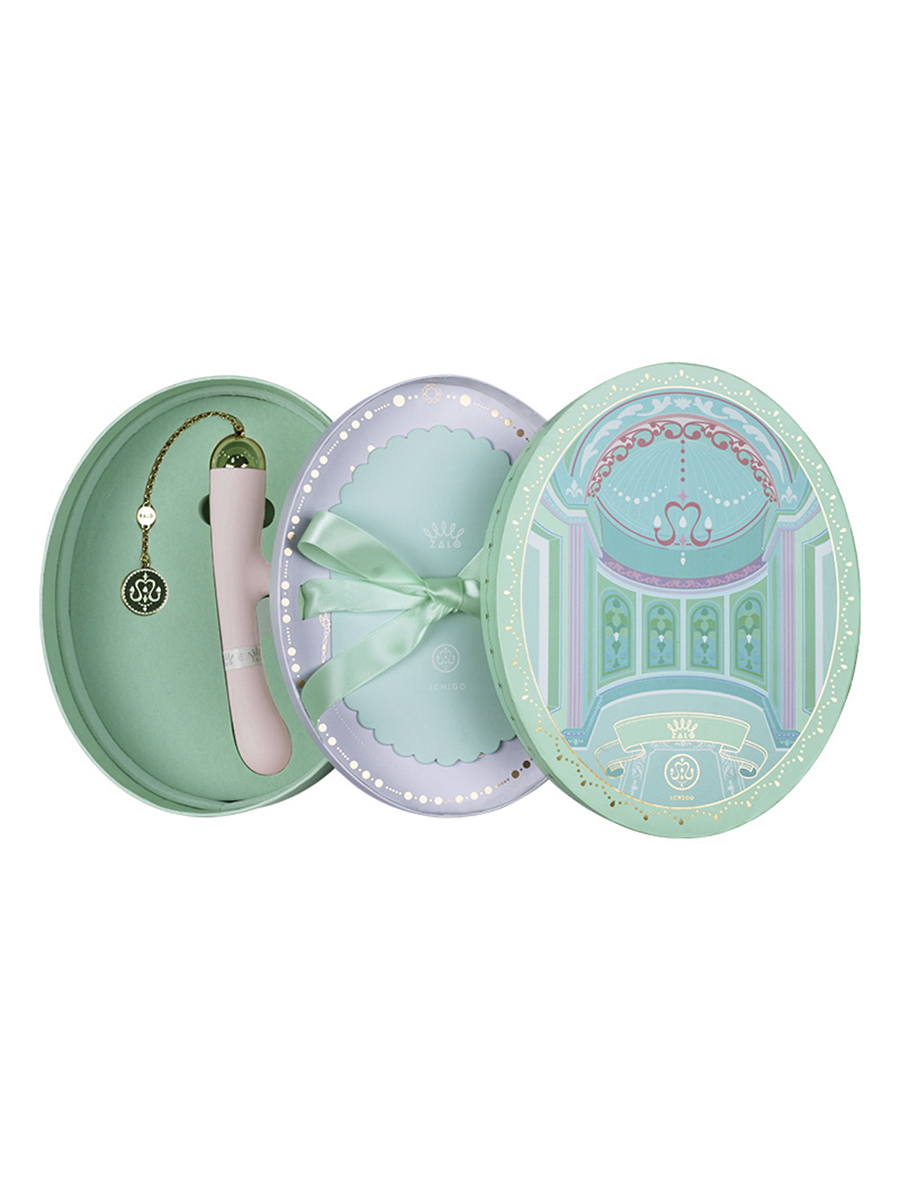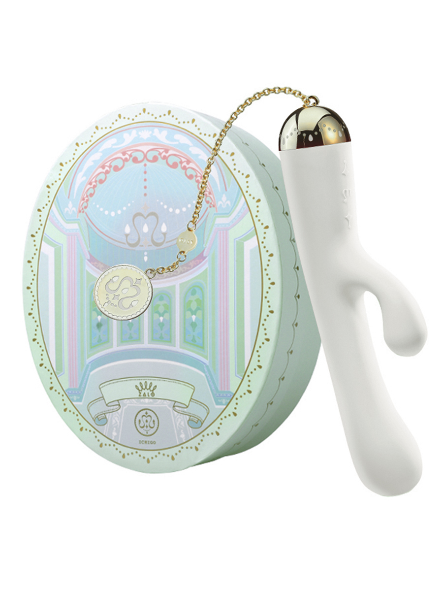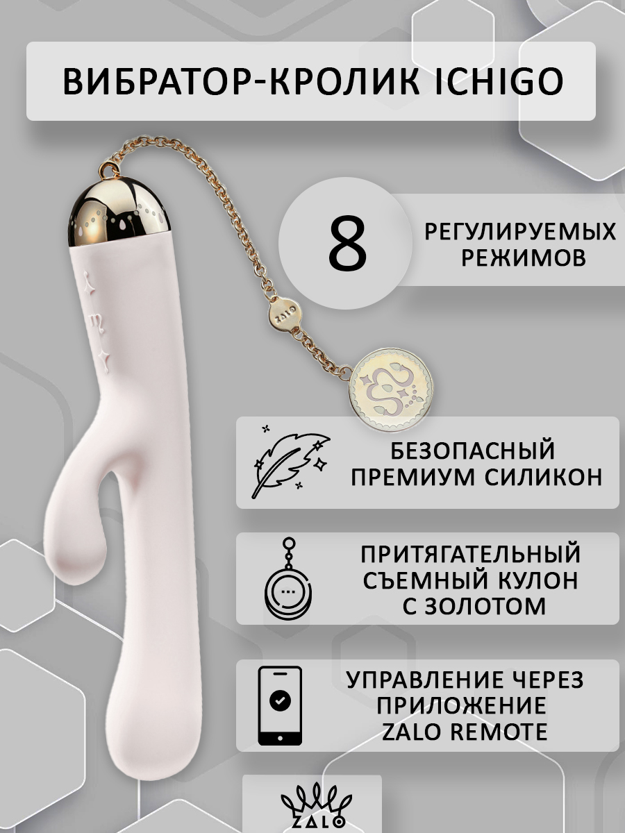 Утонченный и изысканный вибратор-кролик от компании Zalo способен покорить сердце каждой девушки. Он выполнен из премиум-силикона, а сверху имеет шелковистое покрытие Softek. Девайс завершает притягательная съемная цепочка с золотом на поверхности металла. Ichigo обладает эргономичной формой и немного утолщенной головкой для наилучшей стимуляции зоны точки G, а вибрирующий клиторальный отросток не оставит ни одну представительницу прекрасного пола без оргазма!