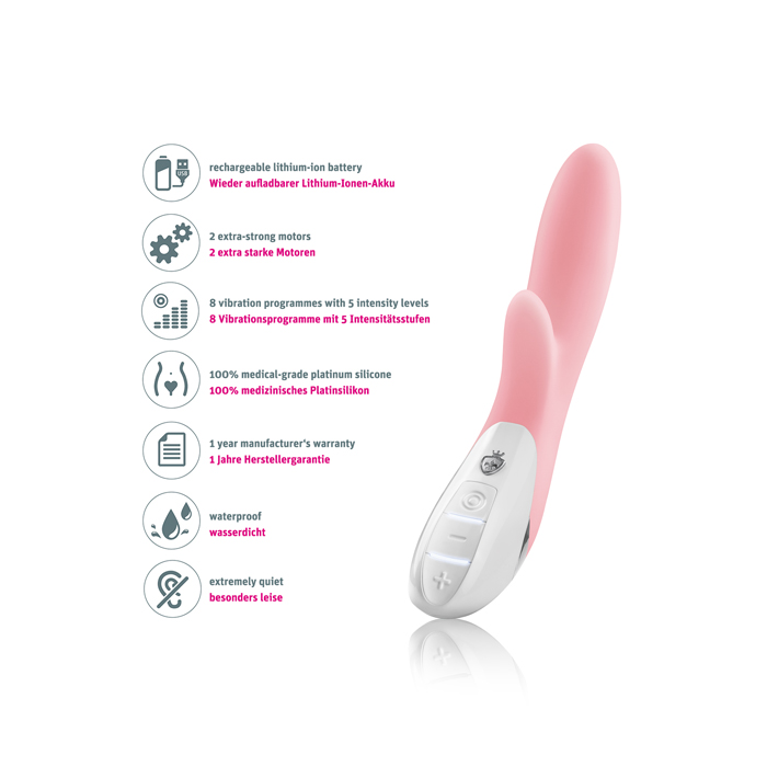 Вибратор-кролик от знаменитого немецкого бренда был создан специально для тех, кто хочет получить незабываемое наслаждение от соло-программы. В нем спрятаны сразу два мощных, но тихих моторчика, которые обеспечат незабываемую вагинальную и клиторальную стимуляцию. Девайс выполнен из нежного и очень приятного на ощупь медицинского силикона. Он порадует своих обладательниц 8 программами проникающей вибрации и 5 уровнями интенсивности.