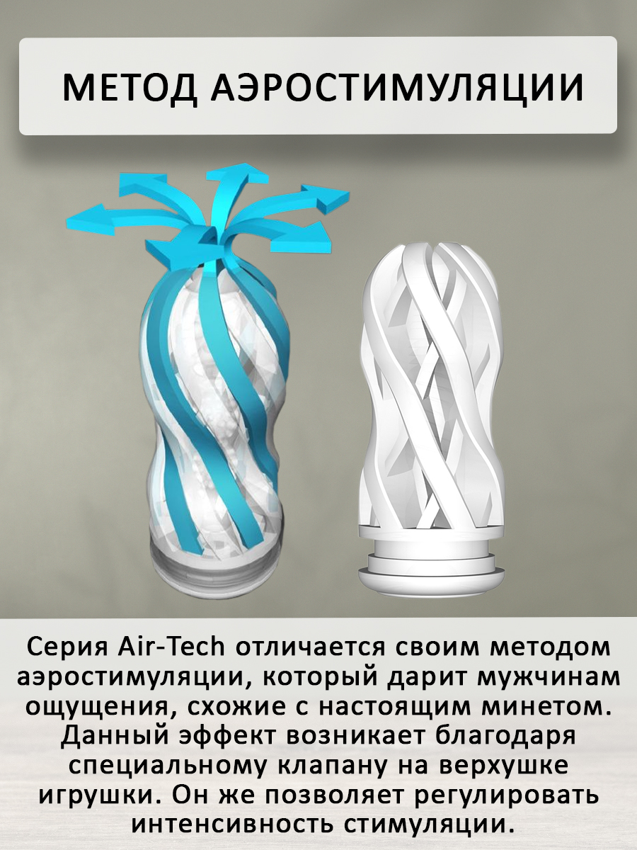 Серия Air-Tech отличается своим методом аэростимуляции, который дарит мужчинам ощущения, схожие с настоящим минетом. Данный эффект возникает благодаря специальному клапану на верхушке игрушки. Он же позволяет регулировать интенсивность стимуляции.