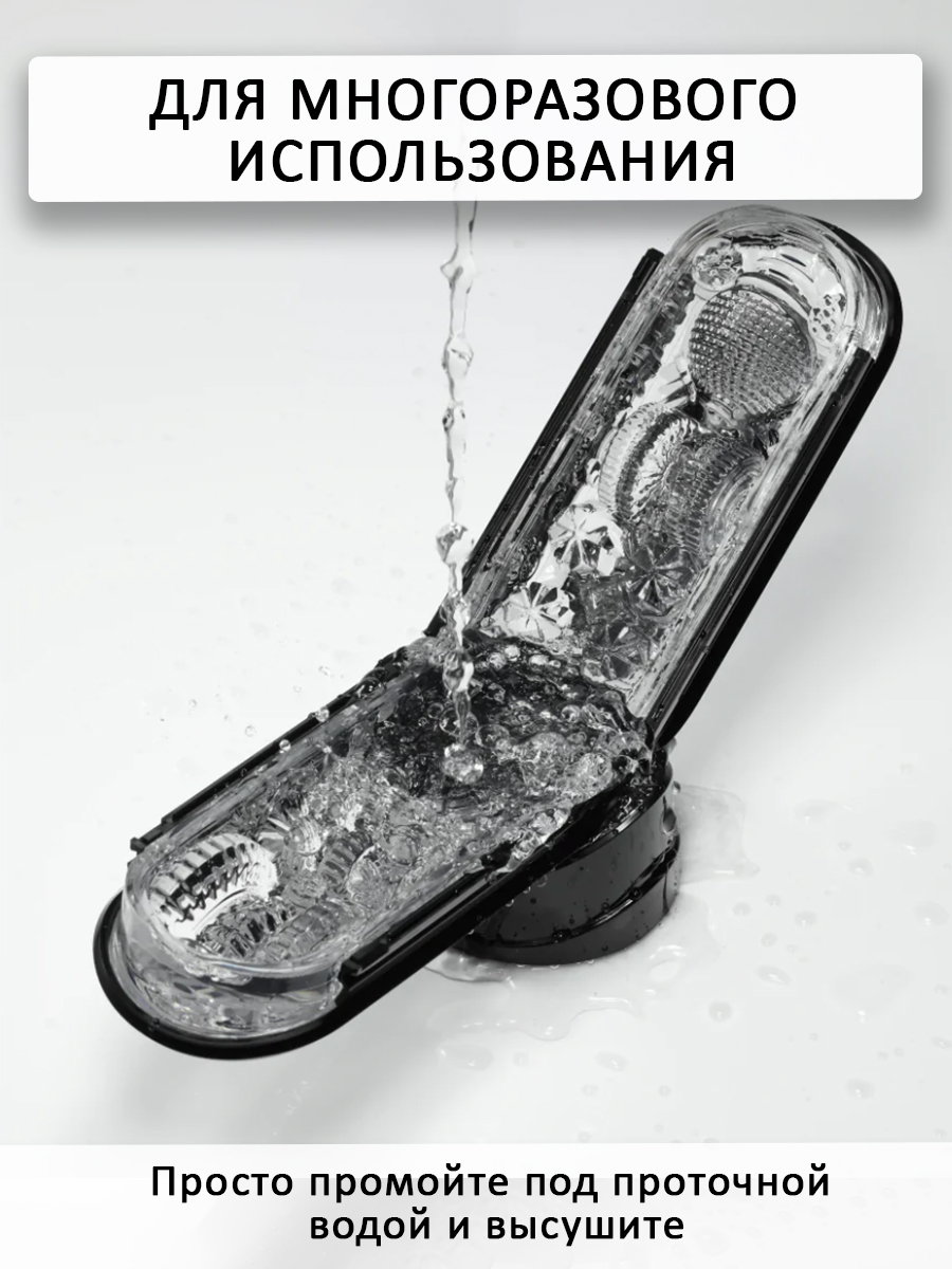 Футуристичный девайс очень удобно ложится в руку и полностью открывается, что позволяет легко добавить в него лубрикант и промыть после использования. Контролировать интенсивность стимуляции можно с помощью небольшой площадки с антискользящим рисунком. Модель имеет самый сложный рельеф из всей серии.