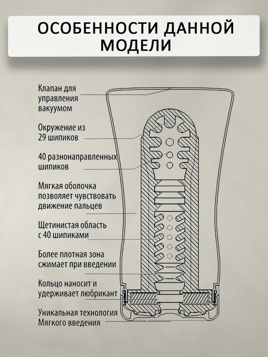 В конце секс-игрушки расположено очень маленькое и почти незаметное отверстие. Оно позволяет создавать вакуумный эффект внутри изделия, радуя мужчину ощущениями, схожими с глубоким минетом. А мягкий корпус обеспечит дополнительную, более интенсивную стимуляцию и полное прилегание внутреннего рукава к стволу пениса.