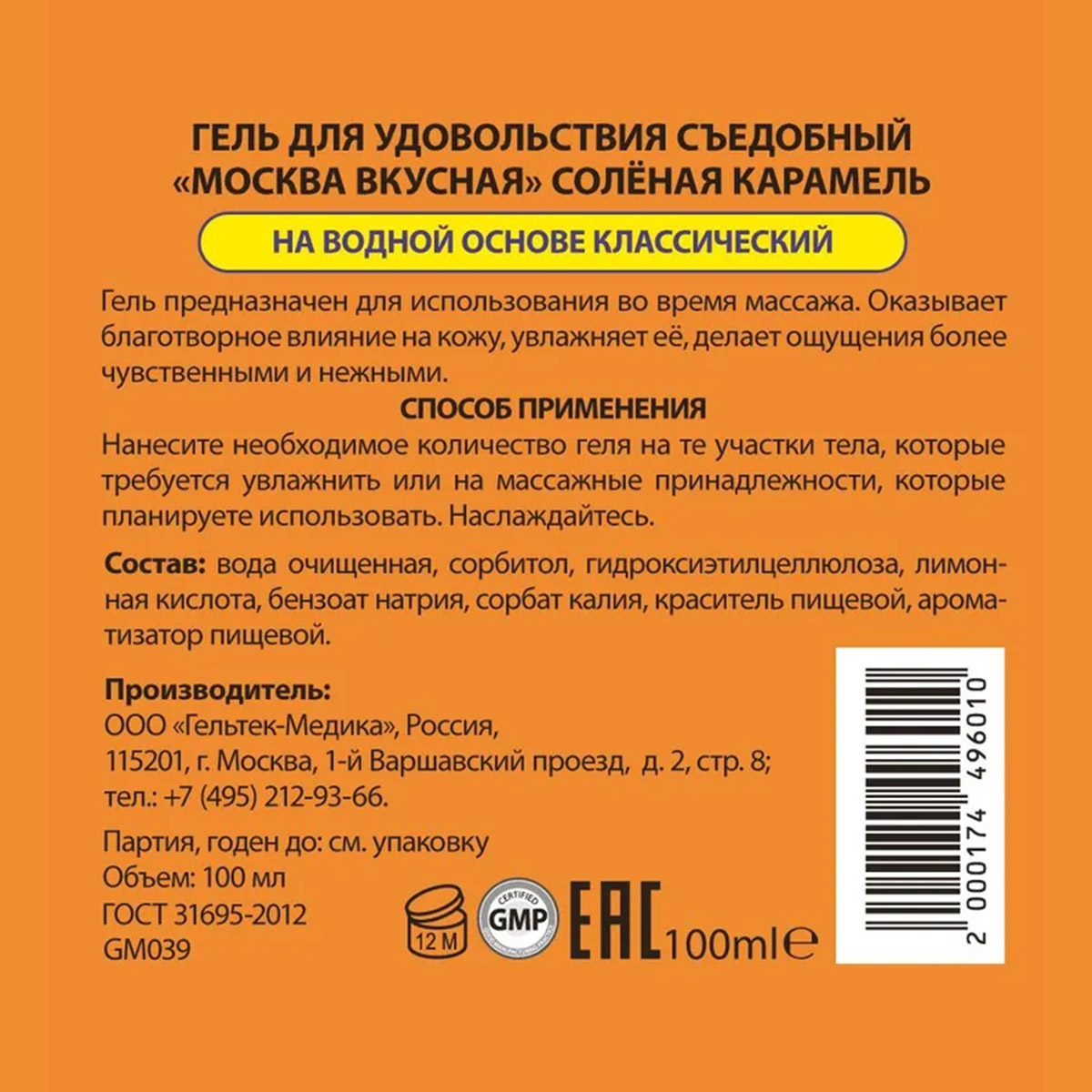 Непревзойденный аромат и приятный вкус лубриканта на водной основе от бренда Москва никого не оставит равнодушным! Он идеально подходит для оральных ласк, так как способствует выработке слюны за счет яркого вкуса соленой карамели, и при необходимости, легко перекрывает вкус естественных выделений. Также, в отличие от большинства съедобных смазок, Москву Вкусную можно использовать для классического секса и вместе с секс-игрушками.