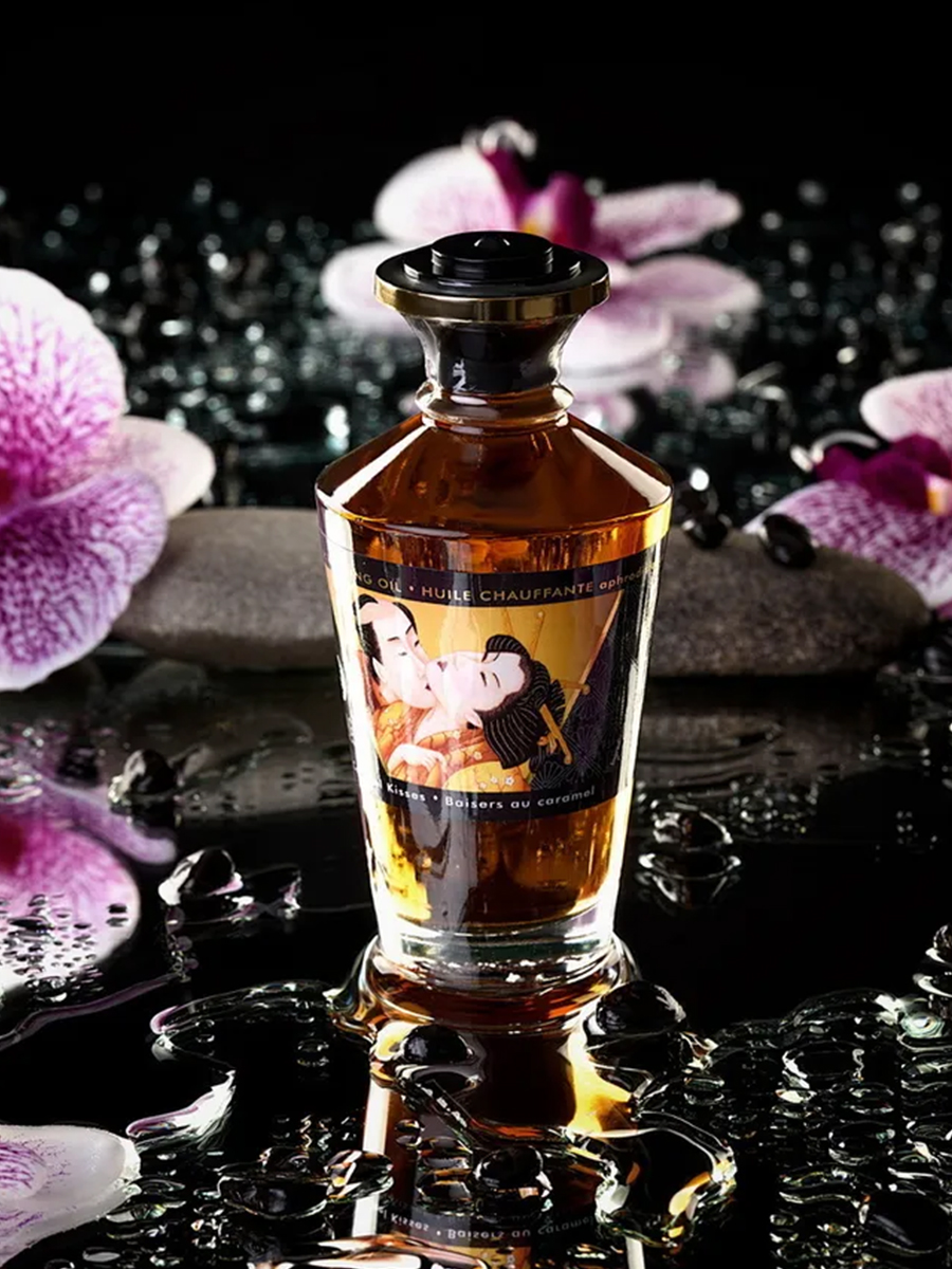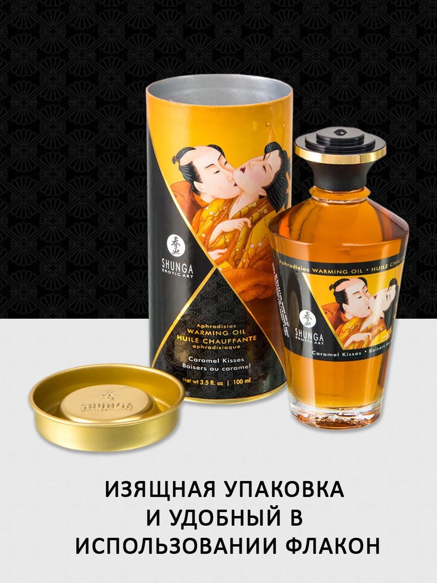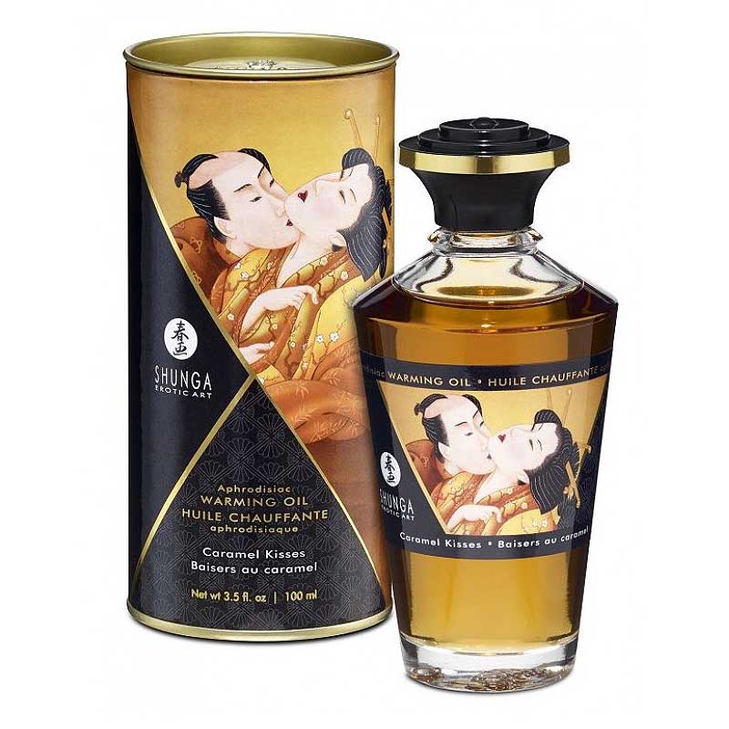 Shunga APHRODISIAC WARMING OIL Caramel Kisses - разогревающее, съедобное масло для тела с натуральным вкусом карамели.