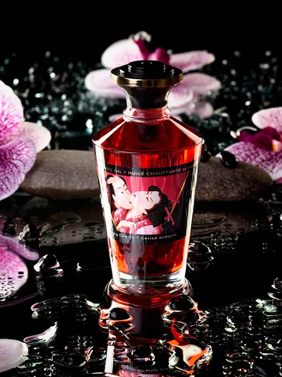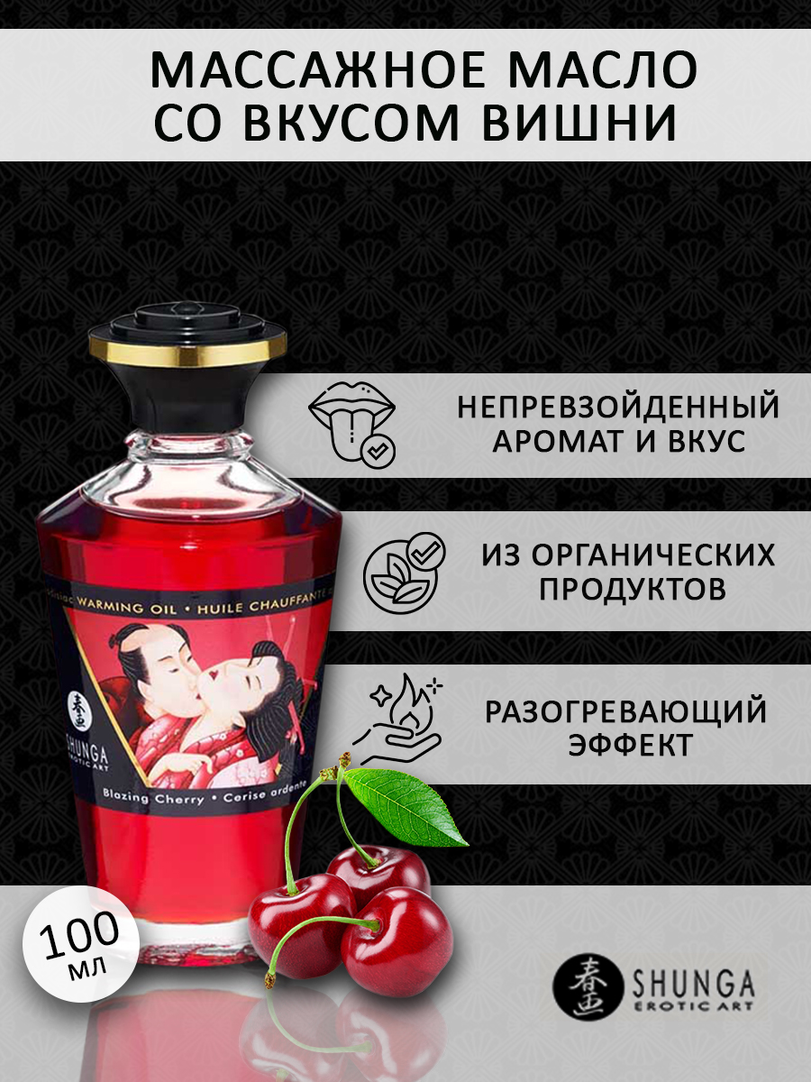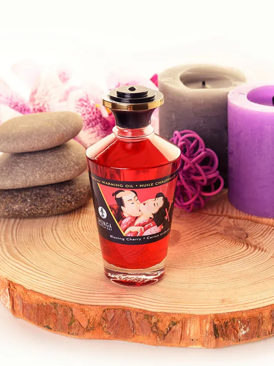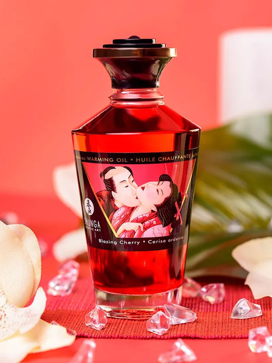 Shunga APHRODISIAC WARMING OIL Blazing Cherry - разогревающее, съедобное масло для тела с натуральным вишневым вкусом.
