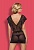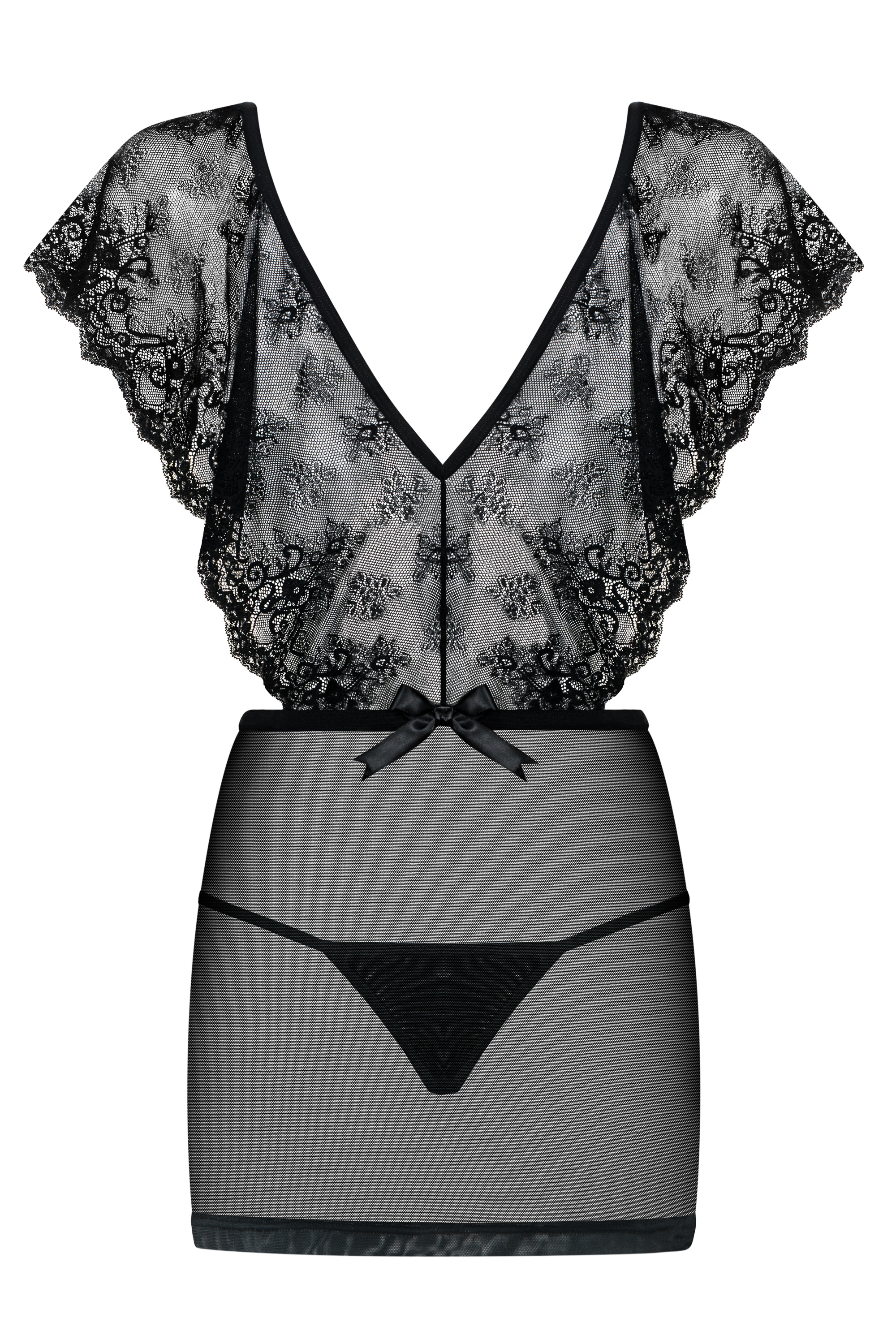 Элегантная полупрозрачная сорочка с глубокой линией декольте и полуоткрытой спиной. Сорочка украшена фурнитурой со стразами в форме бантика. Вырез обрамлен тонкой бархатной каймой, талию подчеркивает вставка из атласной ленты. В комплект входят трусики.