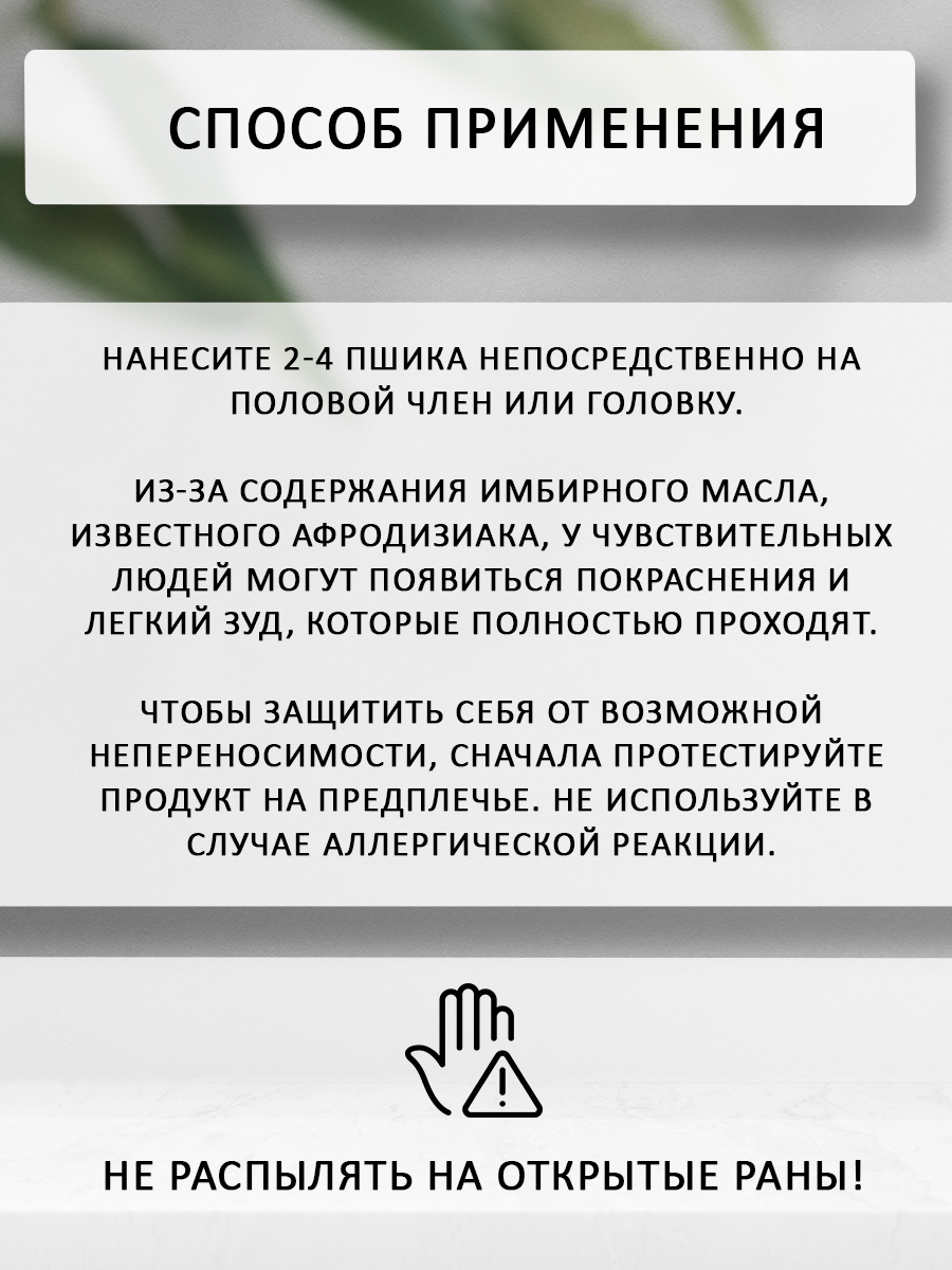 Для полного раскрытия эффекта средства рекомендуется нанести 2-4 дозы на эрегированный мужской половой орган и подождать несколько минут. Долгая и незабываемая ночь обеспечена!