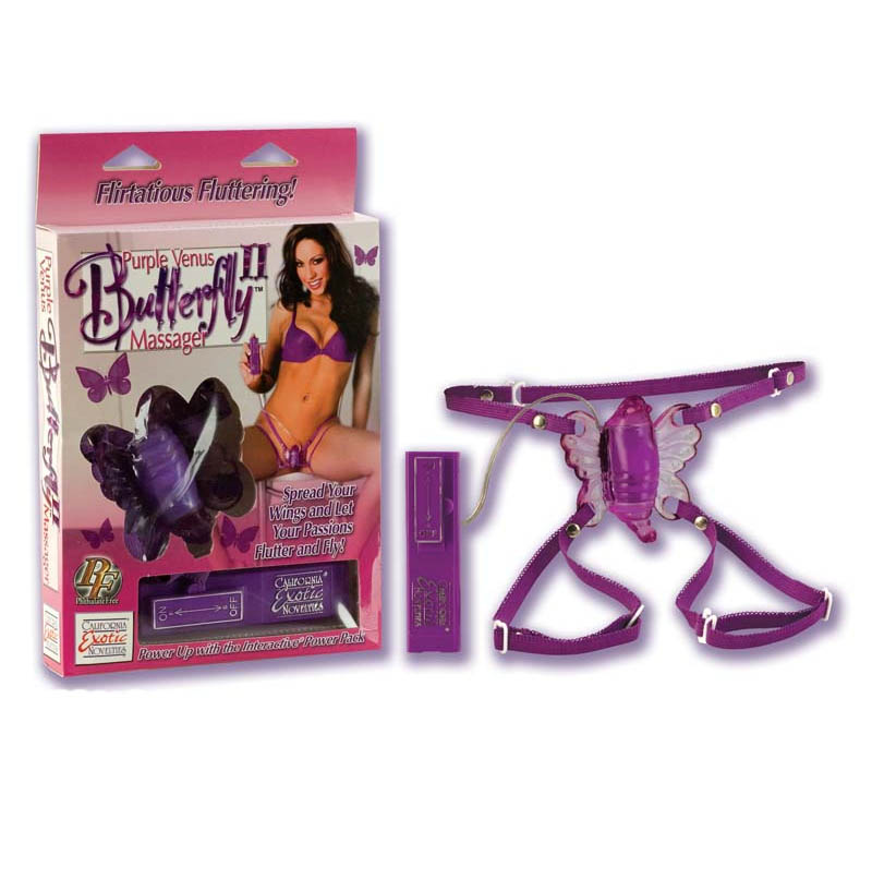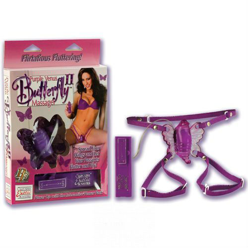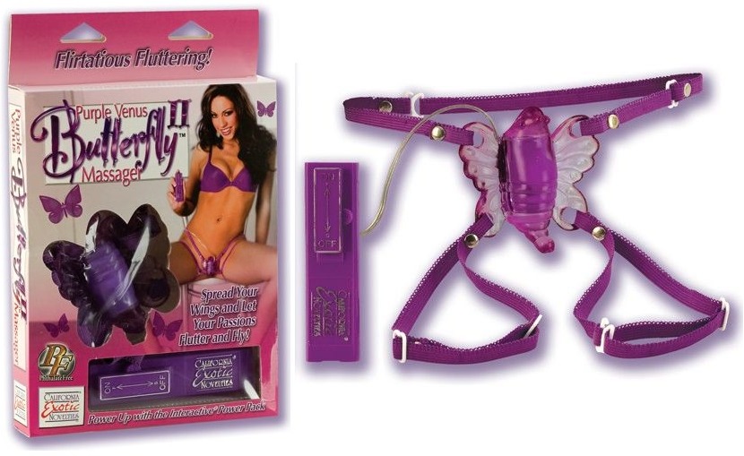 Фиолетовая бабочка на ремешках, крепящихся к телу как трусики стимулирует вибрацией клитор женщины. Имеет три степени вибрации и выносной пульт управления. Пульт работает от трех пальчиковых батареек типа АА.