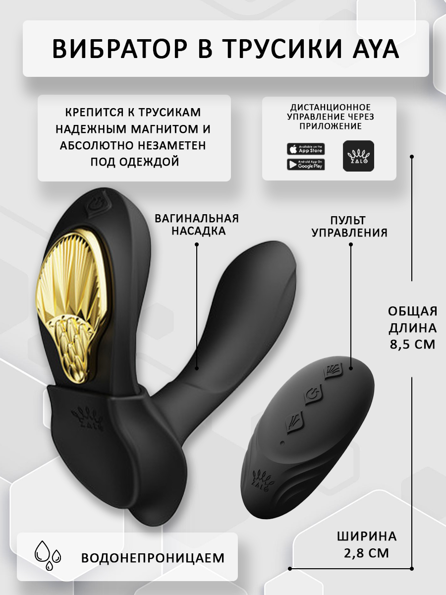 Утонченный и изысканный стимулятор клитора в трусики из коллекции Legend Series способен покорить сердце каждой девушки. Он идеально подойдет для дополнения свидания партнеров, привнесет новые эмоции в их совместное времяпрепровождение, и позволит получить ярчайшую разрядку в любом месте. Девайс крепится к трусикам надежным магнитом и абсолютно незаметен под одеждой. Управление осуществляется с помощью пульта, который позволит переключить программы на расстоянии до 8 метров, или же через приложение ZALO Remote Pro. Также в отличие от другие моделей, у Aya есть специальная вагинальная насадка для тех, кто любит одновременную внутреннюю и внешнюю стимуляцию.