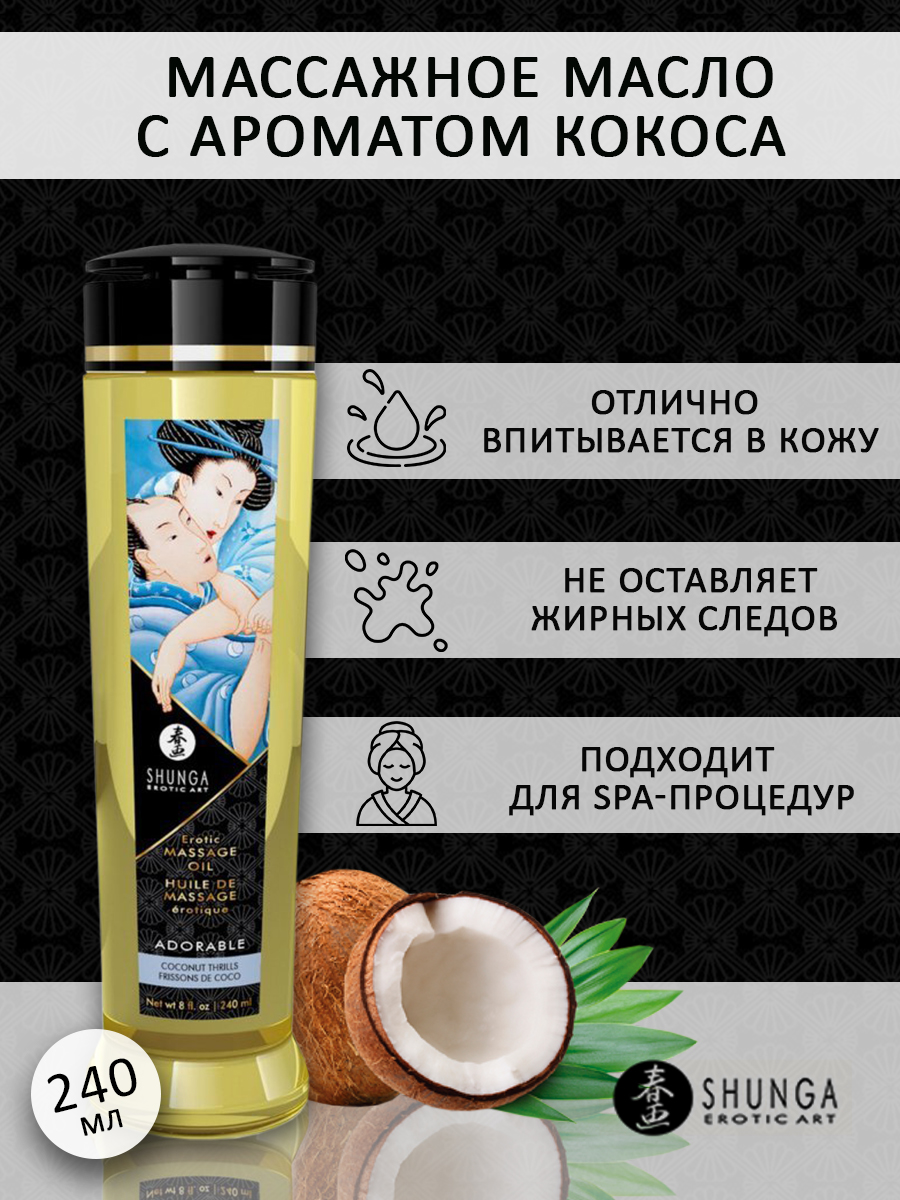 Shunga «Adorable. Coconut Thrills» – классическое массажное масло, которое позволит Вам превратить любовь в настоящее искусство.