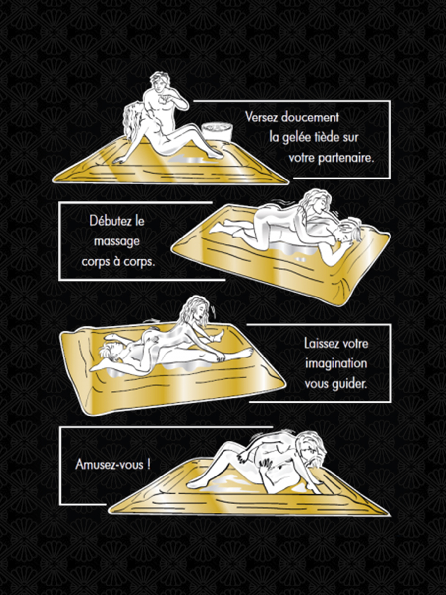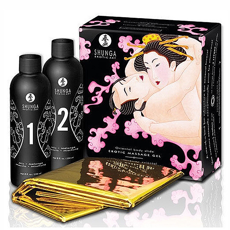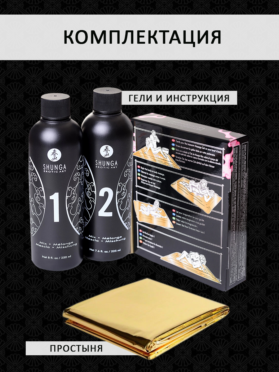 В комплекте супертонкая непромокаемая золотая простыня и два флакона: №1 и №2. Производитель рекомендует поочередно смешивать их с 4 литрами теплой воды. В итоге, Вы получите очень скользкий гель для контактного массажа.