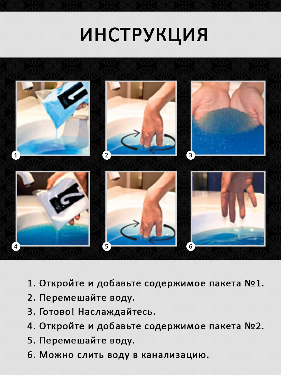 Для нейтрализации гранул будет необходимо добавить порошок из пакетика №2, и гель снова станет обычной водой. Обращаем Ваше внимание, что данный порошок нельзя использовать в джакузи и других подобных ваннах.