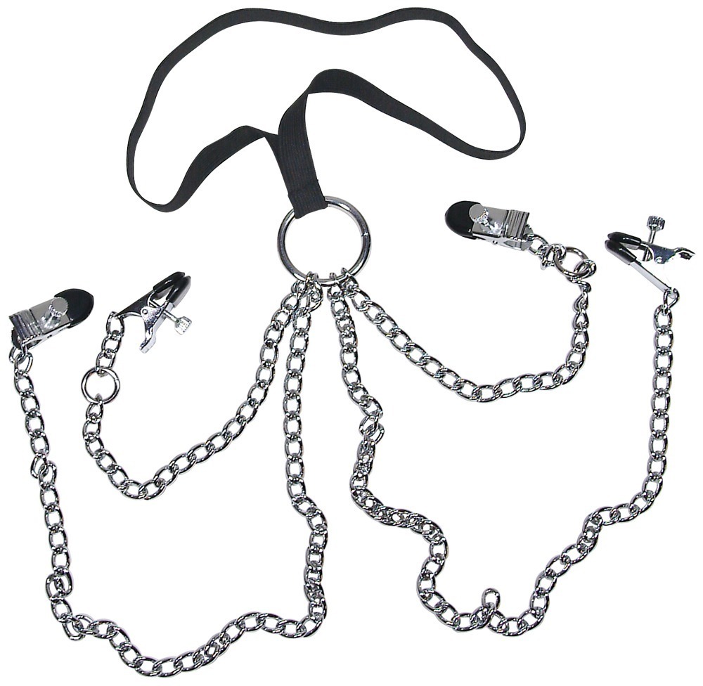 Металлические зажимы на соски соединены прочной цепочкой с зажимами для половых губ и подвеской на шею. Изделие прочно закрепится на теле и придется по душе любителям БДСМ, а также тем, кто давно хотел внести разнообразие в свою сексуальную жизнь. Безопасность для тела обеспечат резиновые накладки.
