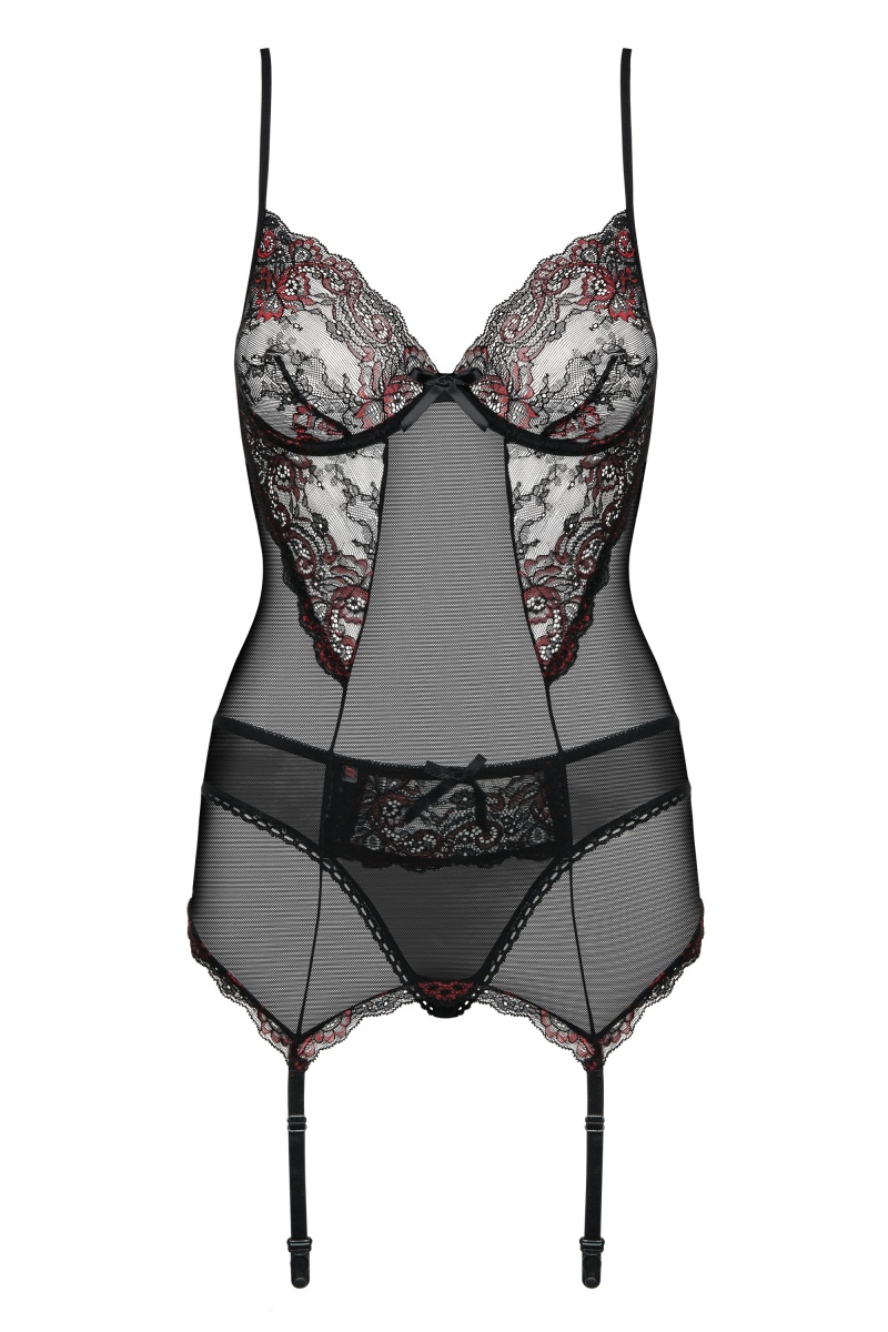 Элегантный полупрозрачный корсет на тонких бретелях, идеально облегает фигуру и подчеркивает формы. Кружевные вставки с ярким цветочным рисунком делают корсет еще более соблазнительным. В комплект входят трусики стринги.